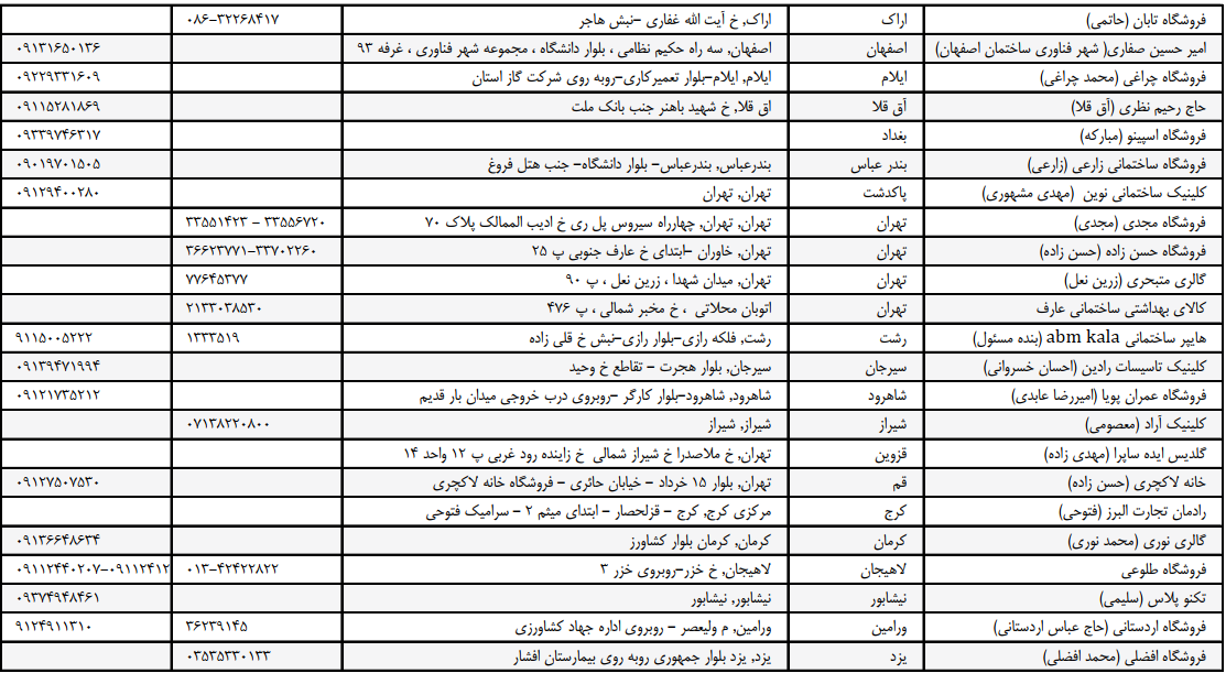 تهران تهران تهران چهارراه سیروس پل ری خ ادیب الممالک پلاک ۷۰ فروشگاه مجدی (مجدی) ۳۳۵۵۱۴۲۳ - ۳۳۵۵۶۷۲۰ *****تهران تهران خاوران ابتدای خ عارف جنوبی پ ۲۵ فروشگاه حسن زاده حسن زاده ۳۶۶۲۳۷۷۱-۳۳۷۰۲۲۶۰ *****تهران تهران میدان شهدا ، زرین نعل ، پ ۹۰ گالری متبحری زرین (نعل ۷۷۶۴۵۳۷۷ *****تهران اتوبان محلاتی ، خ مخبر شمالی ، پ ۴۷۶ کالای بهداشتی ساختمانی عارف ۲۱۳۳۰۳۸۵۳۰